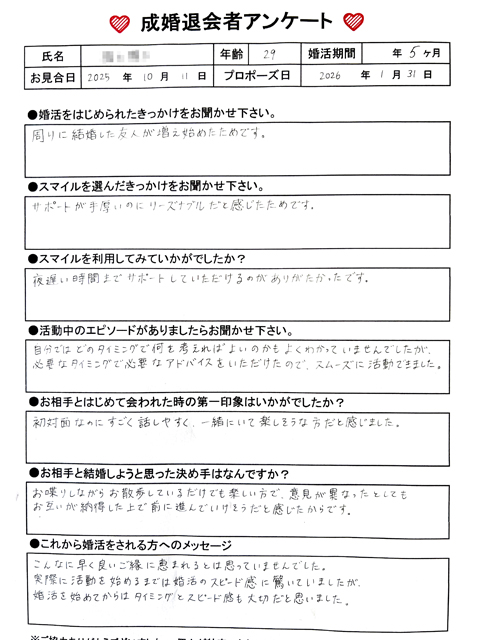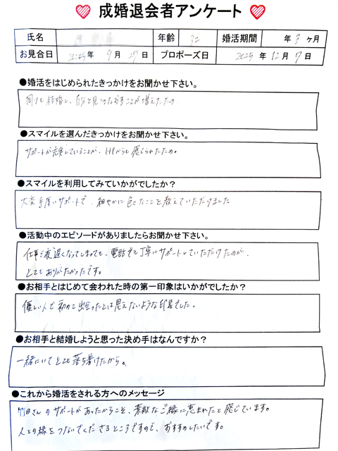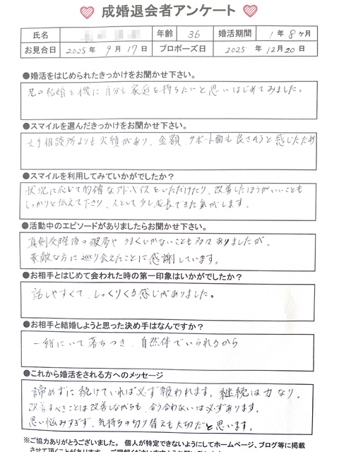 - ※画像をクリックするとご記入いただいた成婚退会者アンケートがご覧いただけます。